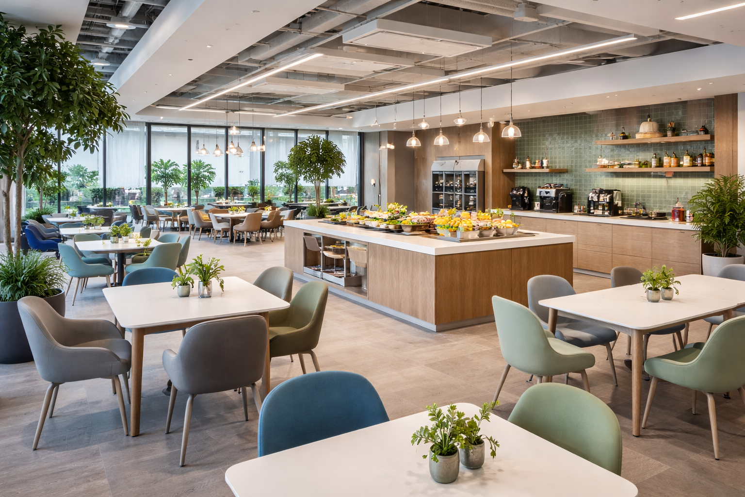 זהו תהליך מקצועי של תכנון חלל אוכל ארגוני, המשלב מטבח, הגשה וישיבה, בהתאמה לתרבות עבודה מודרנית, לעומסים משתנים ולתקנים.